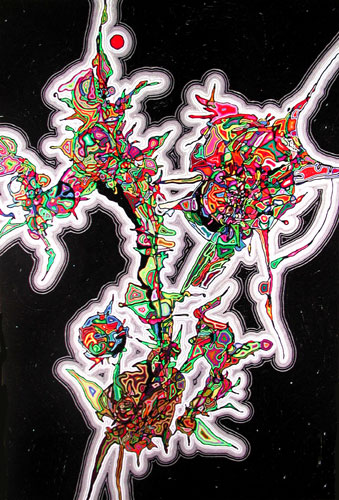 「変容のカムイ」 Yarn on canvas(194X130,3cm) nearika No 10 この絵の下書きは香川大介くんにやってもらった。 絶妙な線にサイケデリックな色彩が爆発する まさに変容=トランス的な作品となった。 title design by michichof