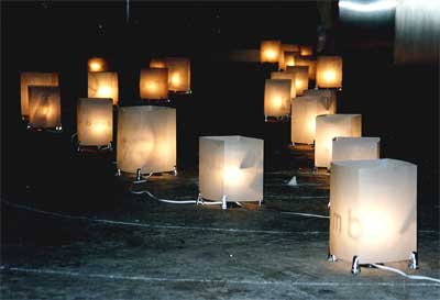 今までいろんな個展をやってきたが、こんな不思議な現象ははじめてだ。 原爆50周年の広島で制作した作品を東京で展示することになった。8月6日の原爆投下日、エノラゲイが標的とした相生橋のうえで、通 行人にダイイング(被害者たちを模して地面に横たわる儀式)してもらった作品だ。設計図などを転写 する青焼き紙に写し取った等身大の青い影で壁を埋めつくすと、ギャラリーが静謐な雰囲気になる。 今回は広島出身の女性アーティスト高村まどかにコラボレートしてもらうことになった。コンクリートの床にチョークで爆心地の円を描き、電球の熱で回転する走馬灯(毎年原爆投下日にドーム前の太田川でおこなわれる灯籠流しがモチーフだ)を太田川の流れにそって配置した。つまり広島の俯瞰図を床に再現したのだ。走馬灯には原子爆弾や原発に関するマークや化学式などが影で浮かび上がり、夜には無気味な美しさをかもし出す。 搬入も終わり、展覧会がはじまった初日から不吉なできごとが相次いだ。 ギャラリーのスタッフが5万円の駐車禁止をくらい、もうひとりがギャラリーの鍵と財布をなくした。搬入を手伝ってくれた友人が交通 事故(幸いケガはなかったが)にあう。高村まどかの灯籠がいくつか回らなくなり、オレの作品のうち二枚が30cmほど破かれていた。ギャラリーにはスタッフが常時ふたり以上いるし、客が破ることなど考えられない。それに作品の最上部に手をのばすには踏み台がないと無理だ。 霊感の強い三田村みどりがいるはずのない影を目撃している。 彼女いわく、「広島の霊を呼び寄せちゃったみたい」という。 |