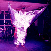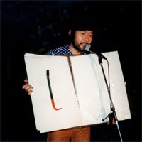 | 第一ラウンドは、「写真」対決。 会場に飾れたとうじ魔とうじの写真作品にスポットが当たる。JRよつや駅の階段を撮った「よつやかいだん」 、段ボール箱にはいった少女を写した「箱入り娘」、とうじ魔とうじの著作「半芸術」の表紙になったメロンにマスクをつけた「マスクメロン」、いちばんウケたのは床にはった細川ふみえのポスター「ふみえ」だ。言うまでもなくキリシタン弾圧の「踏み絵」とかけてある。 オレは「IN&OUT」という写真作品で対抗した。アシスタントの女の子四人が1枚ずつパネルをもって登場した。1枚のパネルには32枚のLサイズプリントが列んでる。 「IN=食べたもの」と「OUT=出したもの」の写真日記だ。食事前には必ず食べ物の写 真を撮り、そのあとに排泄した物を撮った。アシスタントがパネルをもって会場をまわると、パニックになった。遠くからだとなんだかわからないが、近づいてはじめて食べ物とウンコの写 真だとわかるのだ。 第二ラウンドは、「しりとり」対決。 とうじ魔とうじはランダムな電話番号を押し、まじめな声で告げる。「こちら日本しりとり協会ですが、モニターに御協力下さい」相手に返事のすきをあたえぬ まま「りんご」するとつい相手は条件反射で「ゴリラ」と答えてしまう。「ラッパ」「パンツ」などとつづく。もちろん電話は増幅されて会場全体に聞こえるので、みんな固唾をのんで聞き耳を立てている。相手が15秒ほどつまったところで「御協力ありがとうございました」と切る。 オレは黙って会場の人にいろんな物品をもたせていった。 「それでは立体しりとりをはじめます。制限時間は5秒です。まちがった人はこのラウンドが終わるまで……立ってなさい!」 順番に拡声器をわたされ、自分のもっている物品の名を叫ぶ。一見かんたんなようだが、たとえば「みかん」をわたされた人は「ん」で終わるので、困ってしまう。しかしまえの人が「ラジオ」、あとの人が「磁石」をもっているので 「オレンジ」という抜け道に気づくという具合だ。若い女の子に真鍮のボールをにぎらせた。まえの人が「ちまき」、あとの人が「マンゴ」をもっている。拡声器をわたされ、答えはわかっているが、言えない。ぼそぼそとつぶやく。「もっと大きな声で」とオレがせまる。女の子は顔を真っ赤にして叫んだ。 「金玉!」 第三ラウンドは、「コスプレ」対決。 とうじ魔とうじはアルミ素材でできた不思議な服で登場した。名づけて「メタル仮面 」。両手を伸ばすと2m四方のヒトデ型に広がるし、ひざを抱えてしゃがむと50cmくらいの塊になってしまう。ピックアップマイクのとりつけられた服からはしわが伸びたり縮んだりするたびに巨大なノイズが発せられる。ビニール袋を丸めるときの何十倍の音だ。しかし「見せる音楽家」である彼にとっては、あくまで演奏なのだ。 オレは真っ白い半そでの開襟シャツを着て登場した。くるっと見せた背中にスポットがあたる。みごとに男性器と女性器が結合した写 真が背中にプリントされている。これを名付けて、 「ポルノ開襟シャツ」 第四ラウンドは、「詩」対決。 とうじ魔とうじはテレクラのティッシュや家電製品の説明書などをNHK風のBGMにのせ、気品高く朗読する。最後にラーメンにのってる「なると」をつまんで朗読した。 「の」 オレは巨大ノートにさまざまなオブジェを貼り付けた「現代し手帖」を朗読した。傘の取っ手、くぎ抜き、草刈り鎌、大人のおもちゃのバイブなど、「し」の形をしたものがならぶ。最後のページは死んだミミズでしめくられた。 最終ラウンドは、「紙芝居」対決。 とうじ魔とうじは、「桃太郎」の紙芝居を見せながら「花咲かじじい」のストーリーを読む「ダブる紙芝居」を演じた。 オレは「処女マリアの皿」という文字紙芝居だ。 皿皿皿皿皿皿皿皿皿 皿皿皿皿皿皿皿皿皿皿皿皿皿 皿皿皿皿皿皿皿皿皿皿皿皿皿皿皿 皿皿皿皿皿皿皿皿皿皿皿皿皿皿皿皿皿 皿皿皿皿皿皿皿皿皿皿皿皿皿皿皿皿皿皿皿 皿皿皿皿皿皿皿皿皿皿皿皿皿皿皿皿皿皿皿 皿皿皿皿皿皿皿皿皿皿皿皿皿皿皿皿皿皿皿 皿皿皿皿皿皿皿皿皿皿皿皿皿皿皿皿皿 皿皿皿皿皿皿皿皿皿皿皿皿皿皿皿 皿皿皿皿皿皿皿皿皿皿皿皿皿 皿皿皿皿皿皿皿皿皿 マリアの皿に血が降ってくる。オレは注射器で自分の血を抜いて「皿」の字に点をつけていく。 血血血血血血血血血 血血血血血血血血血血血血血 血血血血血血血血血血血血血血血 血血血血血血血血血血血血血血血血血 血血血血血血血血血血血血血血血血血血血 血血血血血血血血血血血血血血血血血血血 血血血血血血血血血血血血血血血血血血血 血血血血血血血血血血血血血血血血血 血血血血血血血血血血血血血血血 血血血血血血血血血血血血血 血血血血血血血血血 「処女マリアの皿」が「処女マリアの血」に変わった。 |