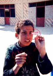 | いきなり「野ざらし画郎サハラ支部長」に任命され、鼻水を噴き出しながら驚くハッサン・ハダット氏(11歳) | 砂漠にはほめるものや人を見つけるのがむずかしい。早く砂漠化を食い止めなければ、ほめるものがなくなってしまう! |