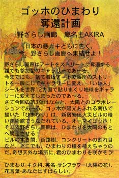 野ざらし画廊第3弾はなんと、太陽とのコラボレーションであ〜る。ゴッホが陽光あふれる南仏で描いた「ひまわり」は、新宿安田火災ビルの暗い美術館でうなだれている。