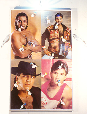 ポスター、ドーナッツ型蛍光灯、羽、毛糸の帽子とリボンをつけたオナニー済みティッシュ