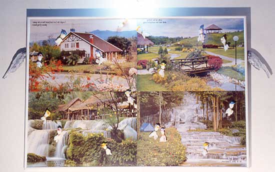 ポスター、ドーナッツ型蛍光灯、羽、毛糸の帽子とリボンをつけたオナニー済みティッシュ