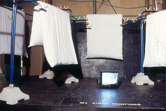 | 渋谷スペースエッジの 入口を入ると5組の物干し台にふとんが干してある。 よく近づいてみると5枚のふとん全部に黄色いシミがついている。そう、オネショぶとんだ。 真ん中にはテレビモニターがあり、1959年当時おやじがダブル8ミリ映画で撮った0才〜3才までのオレが映し出される。 子供の頃オネショ小僧だったオレは、その罰としてふとんを通りに面した物干し竿に干された。その恥ずかしさとトラウマがこの作品を作らせたと言ってもいい。そう、あの頃のオネショぶとんは公衆へと展示された最初のスカトロアートだったのである。 『クリネックス天使の詩』 右手奥の展示室だが、これはBlueで展示されたものと同じなので説明は省く。 |